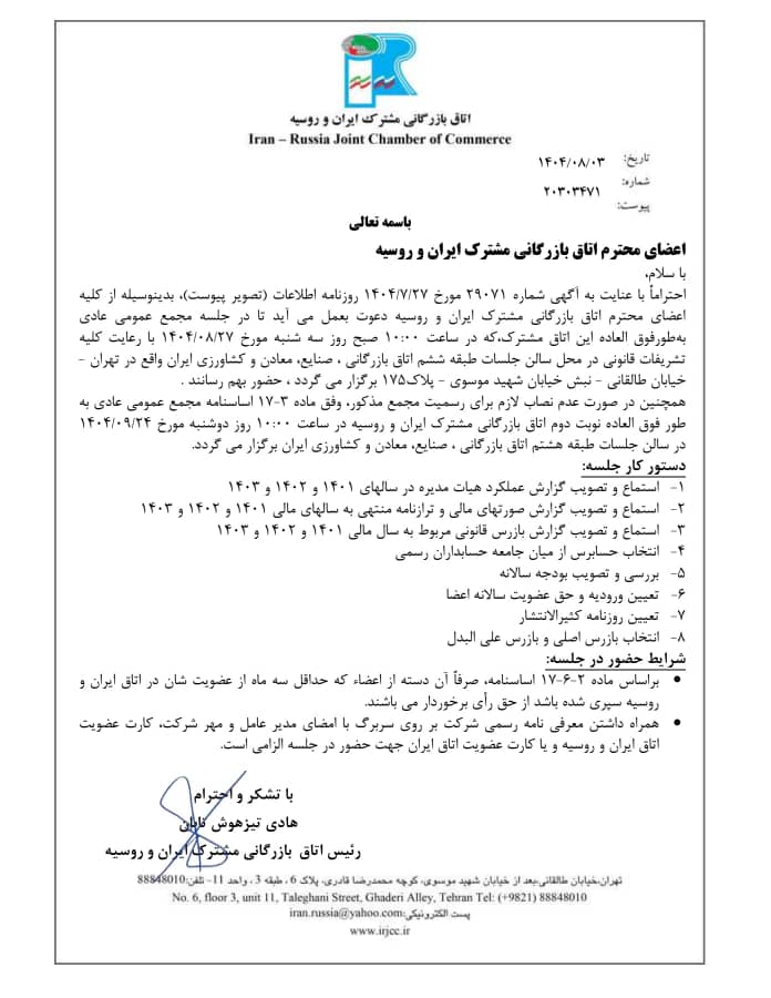 بدینوسیله از اعضاى محترم اتاق بازرگانى مشترک ایران و روسیه دعوت بعمل می آید تا در جلسهی مجمع عمومی عادی به طور فوق العاده این اتاق مشترک، که در ساعت ۱۰ صبح روز سه شنبه مورخ ۱۴۰۴/۰۸/۲۷ با رعایت کلیه تشریفات قانونی در محل سالن جلسات طبقه ششم اتاق بازرگانی، صنایع، معادن و کشاورزى ایران واقع در تهران – خیابان طالقانی – نبش خیابان شهید موسوی – پلاک ۱۷۵ برگزار میگردد، حضور بهم رسانند.